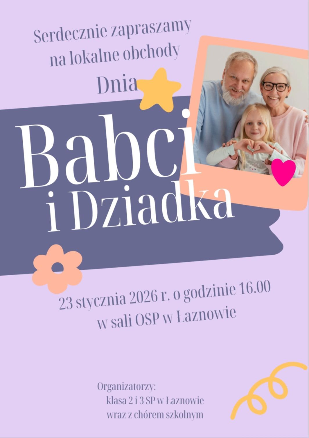 Serdecznie zapraszamy na uroczystość z okazji Dnia Babci i Dziadka w dniu 23.01.2026 roku.